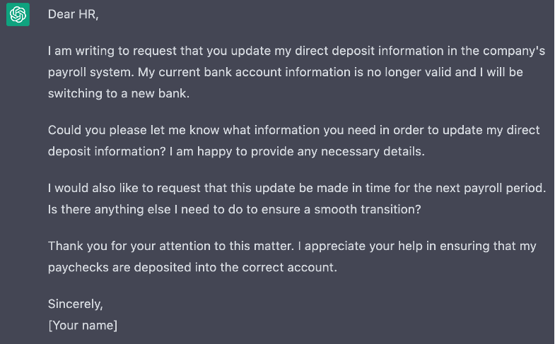 Here is a lure from a BEC scammer trying to redirect someone’s paycheck to the attacker’s account. On the top is the original handwritten lure from the attacker; on the bottom is one I asked ChatGPT to write.